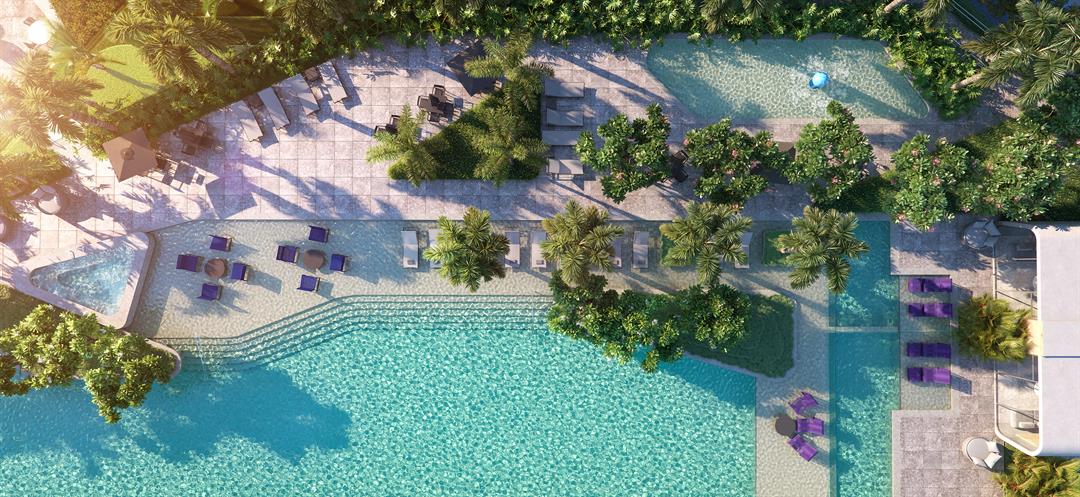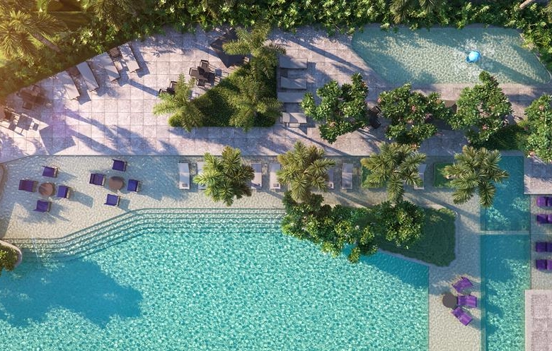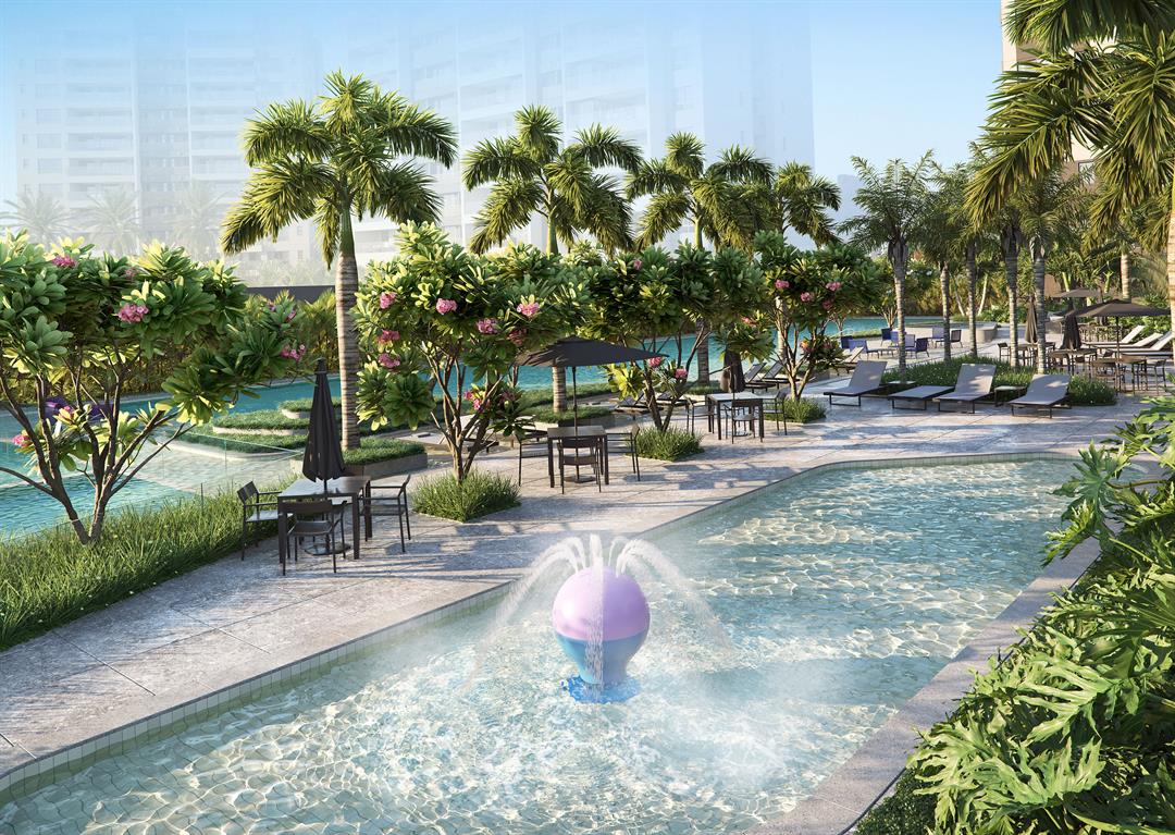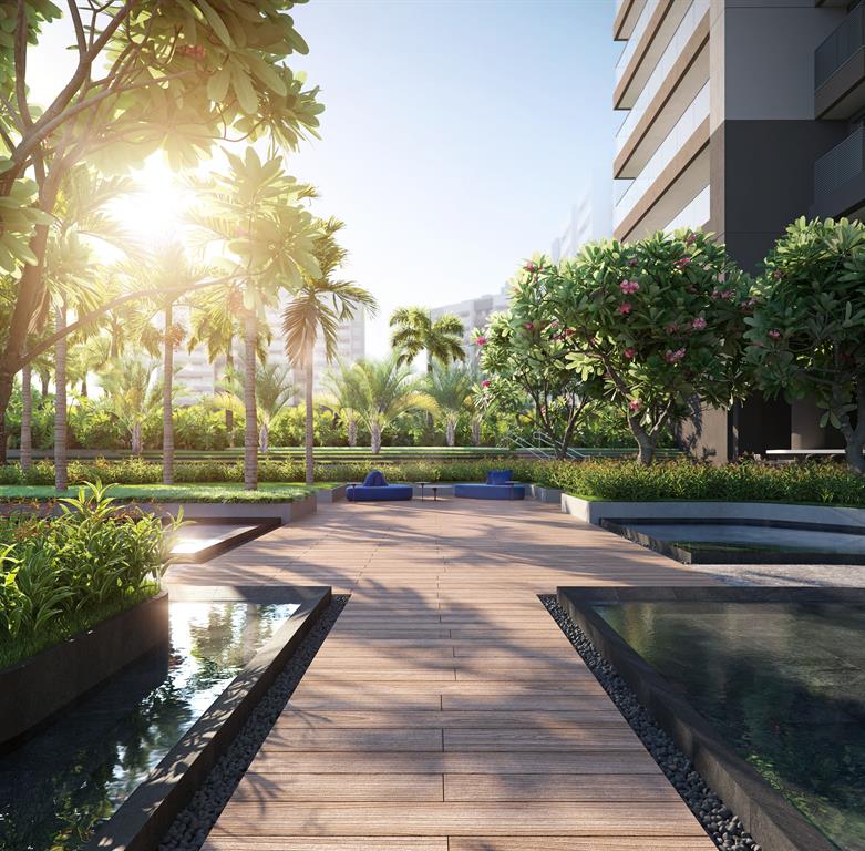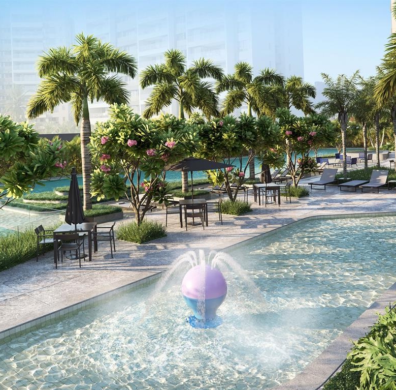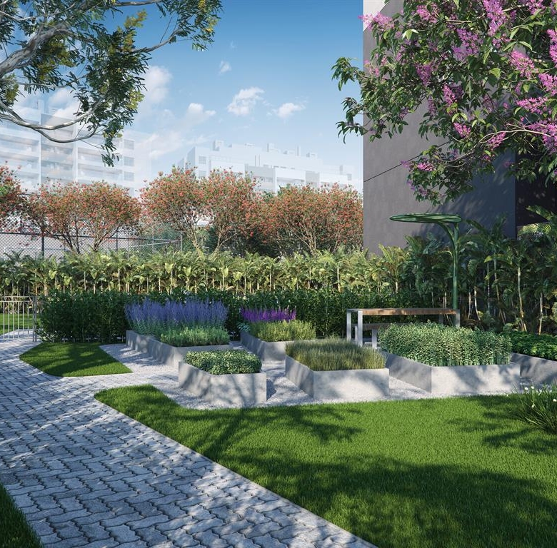 O paisagismo e a área de lazer são pensadas para todos os elementos da família, desde o cachorrinho até os avós. Um dos destaques é a piscina com raias de 50 metros e que se espraia por deques molhados.